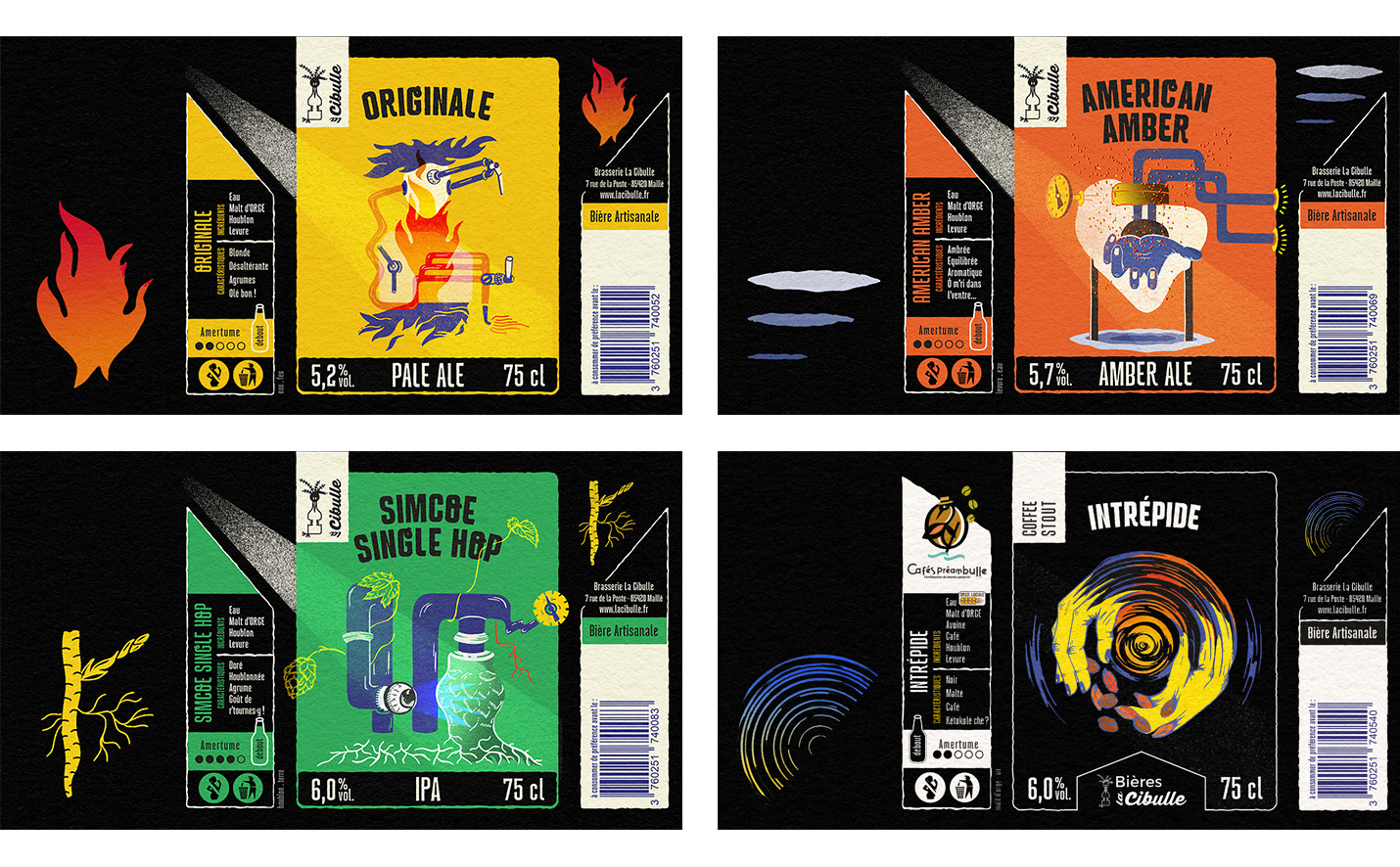La gamme de la Cibulle fait peau neuve avec ces nouveaux graphismes ! L'idée est d'intégrer sur chaque étiquette un élément de la brasserie, un ingrédient et un élément naturel